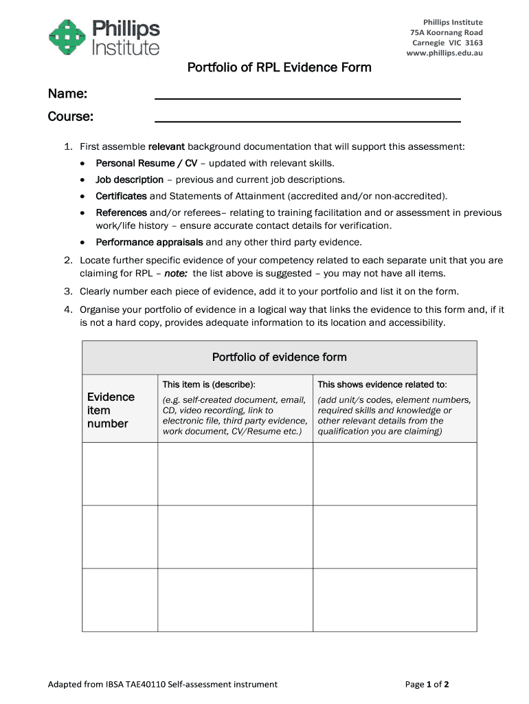 Phillips Institute 75A Morning Road Carnegie VIC 3163 www.phillips.edu.au Portfolio of RPM Evidence Form Name: Course: 1. First assemble relevant background documentation that will support this assessment: