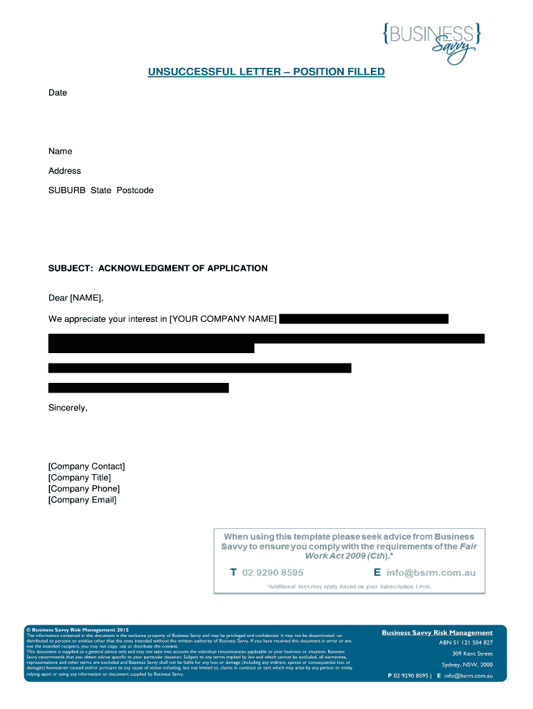 UNSUCCESSFUL LETTER POSITION FILLED Date Name Address SUBURB State Postcode SUBJECT: ACKNOWLEDGMENT OF APPLICATION Dear NAME, We appreciate your interest in YOUR COMPANY NAME and the time you invested