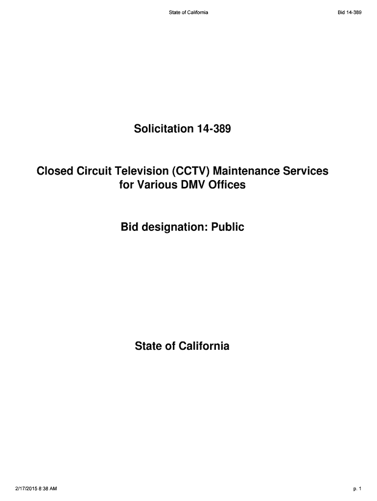 State of California Bid 14389 5 Solicitation 14389 Closed Circuit Television (CCTV) Maintenance Services for Various DMV Offices Bid designation: Public State of California 6 2×17/2015 8:38 AM p.