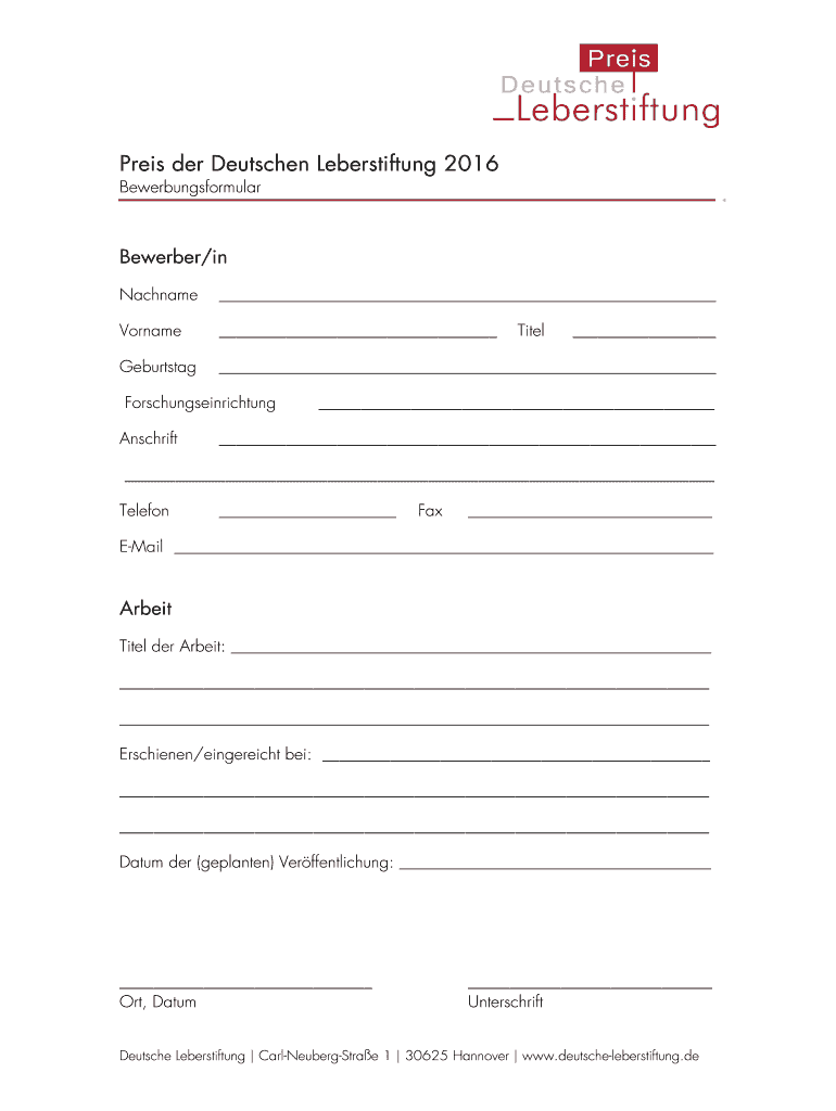 Holen Sie sich kostenlos Preis der Deutschen Leberstiftung 2016 Bewerbungsformular Bewerber/in Na...