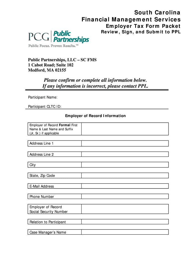 South Carolina Financial Management Services Employer Tax Form Packet Review, Sign, and Submit to PPL Public Partnerships, LLC SC FMS 1 Cabot Road; Suite 102 Medford, MA 02155 Please confirm or complete