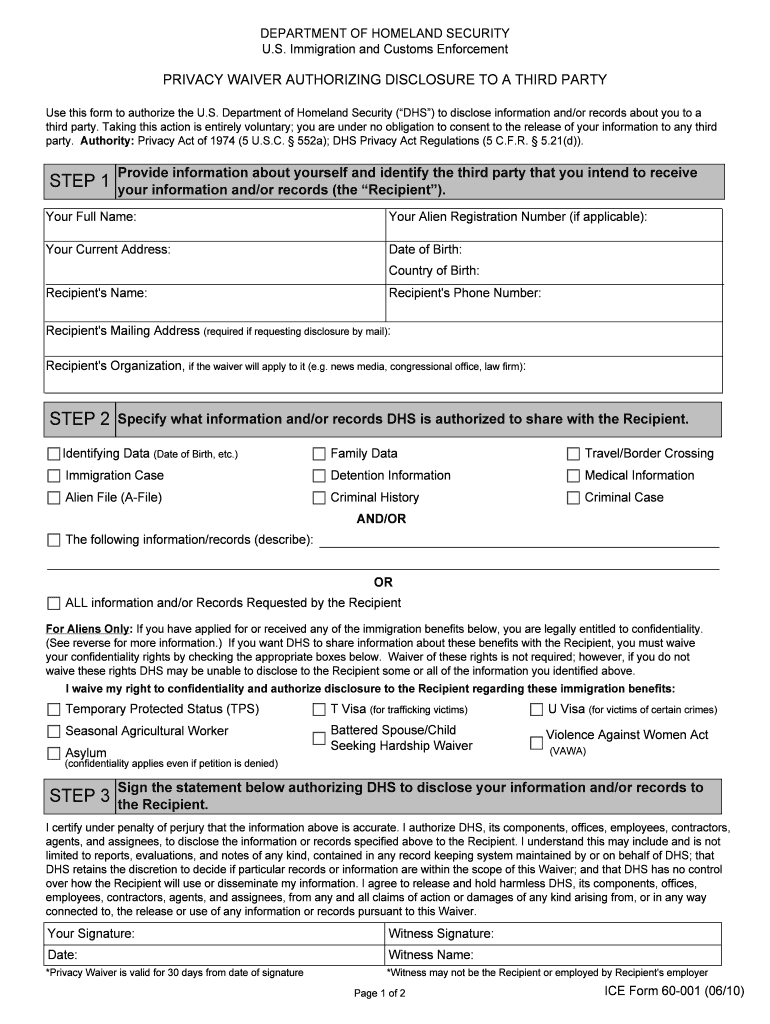 DEPARTMENT OF HOMELAND SECURITY U.S. Immigration and Customs Enforcement PRIVACY WAIVER AUTHORIZING DISCLOSURE TO A THIRD PARTY Use this form to authorize the U.S. Department of Homeland Security