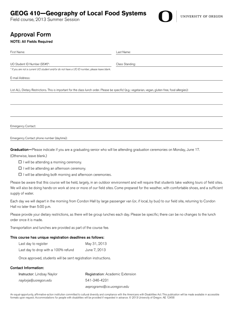 GEOG 410Geography of Local Food Systems Field course, 2013 Summer Session Approval Form NOTE: All Fields Required First Name: Last Name: UO Student ID Number (95#)*: Class Standing: * If you are not