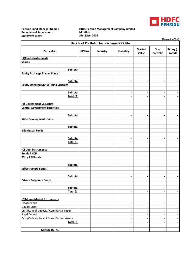 Form 10 Pension Fund Manager Name : Periodicity of Submission: Statement as on: HDFC Pension Management Company Limited Monthly 31st May 2014 (Amount in 'Rs. ') Details of Portfolio for Scheme NPS