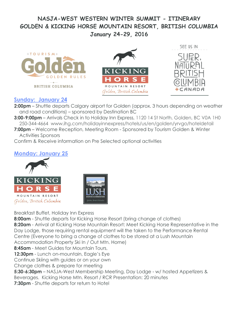 The NARROWEST WESTERN WINTER SUMMIT ITINERARY GOLDEN & KICKING HORSE MOUNTAIN RESORT, BRITISH COLUMBIA January 2429, 2016 Sunday: January 24 2:00pm Shuttle departs Calgary airport for Golden (approx.