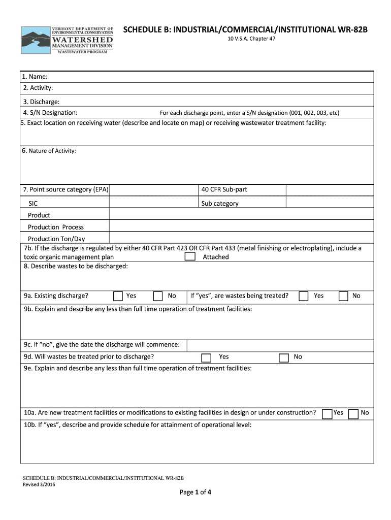 SCHEDULE B: INDUSTRIAL×COMMERCIAL×INSTITUTIONAL WR82B 10 V.S.A. Chapter 47 1. Name: 2. Activity: 3. Discharge: 4. S×N Designation: For each discharge point, enter an S×N designation (001, 002,