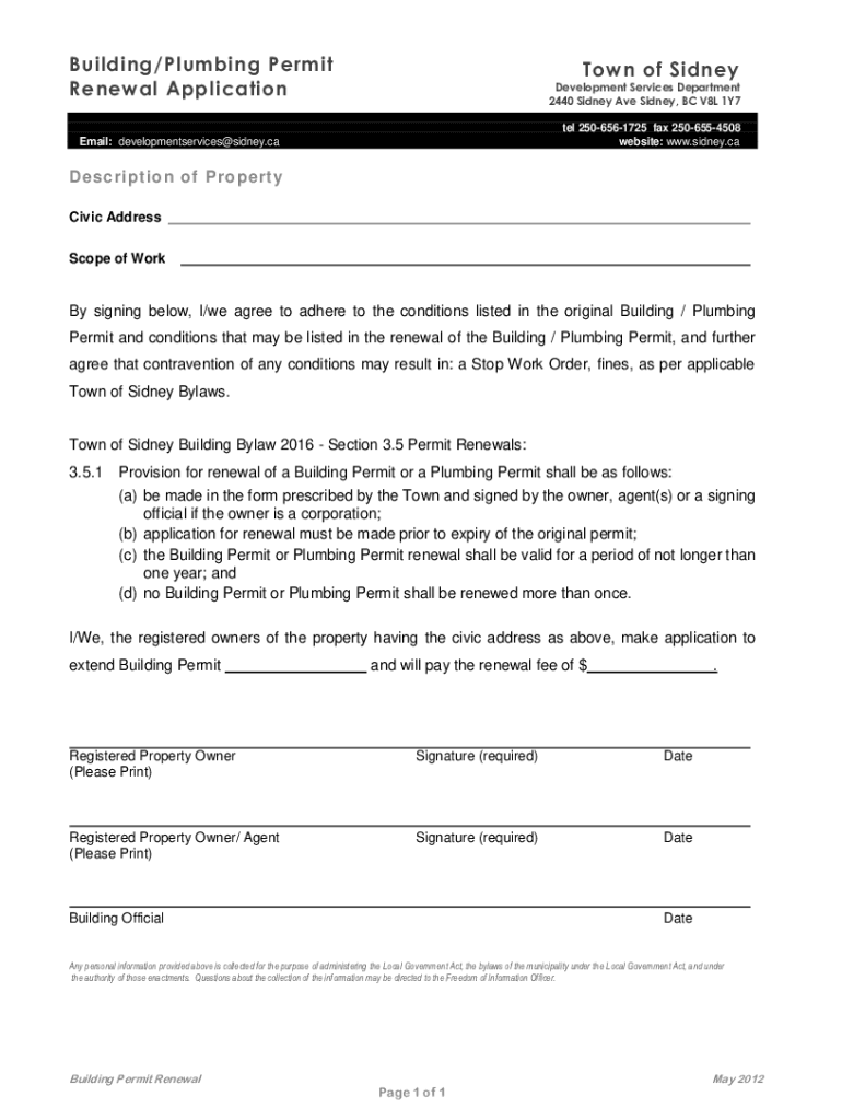 Building/Plumbing Permit Renewal ApplicationTown of SidneyDevelopment Services Department 2440 Sidney Ave Sidney, BC V8L 1Y7 tel 2506561725 faxes 2506554508 websites: www.sidney.caEmail: developmentservices@sidney.caDescription