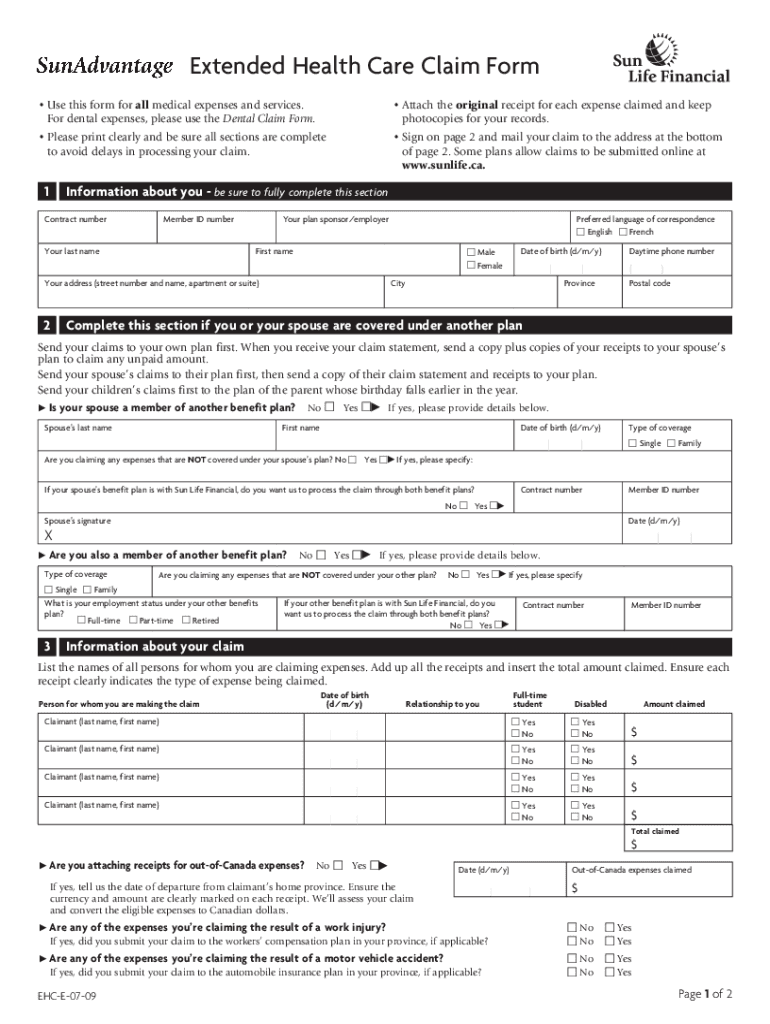 The Extended Health Care Claim Form is a health insurance document used by members to submit medical expense claims to Sun Life Financial.