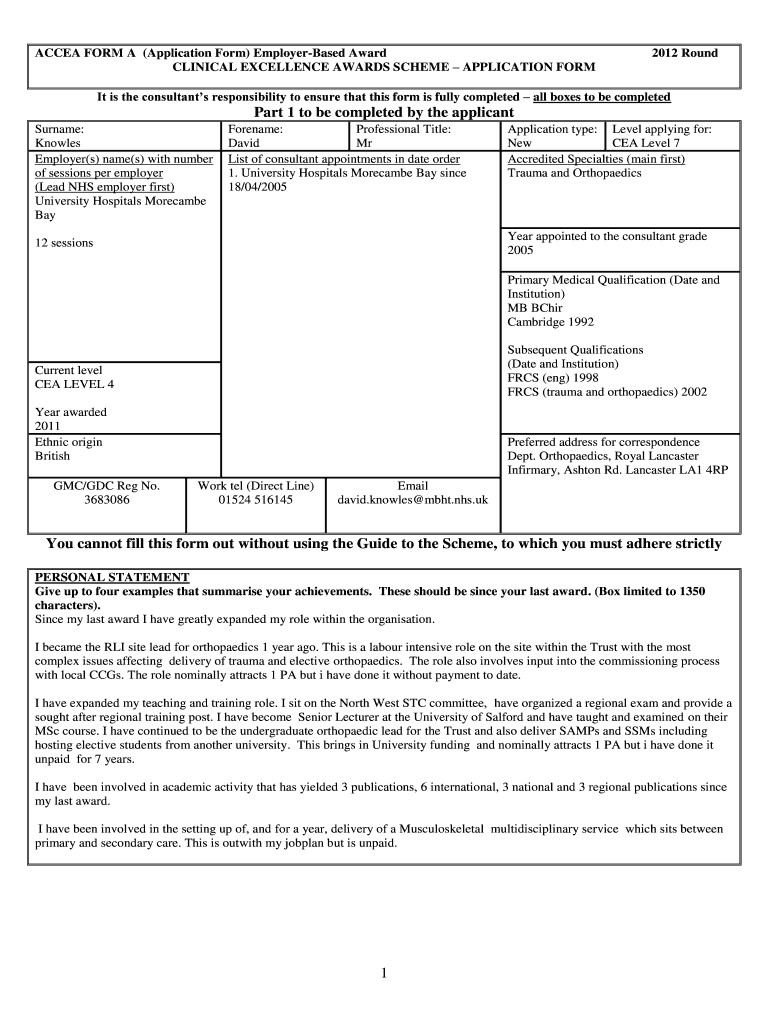 ACCRA FORM A (Application Form) EmployerBased Award CLINICAL EXCELLENCE AWARDS SCHEME APPLICATION FORM 2012 Round It is the consultants' responsibility to ensure that this form is fully completed