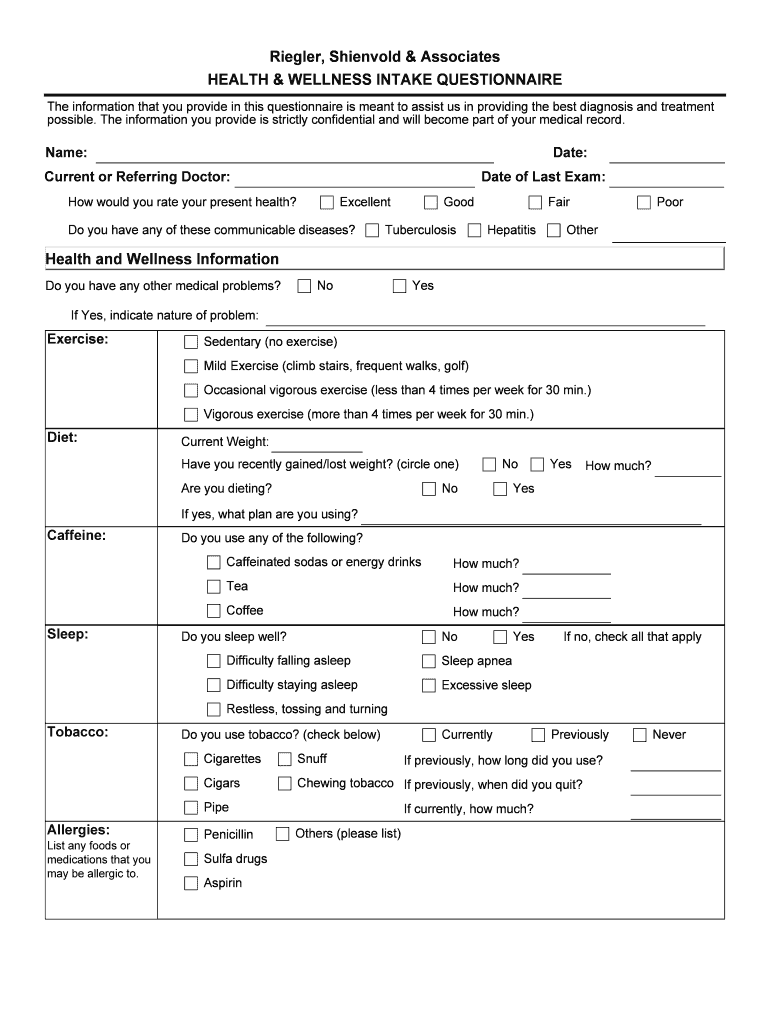 Get the free Health & Wellness Intake Questionnaire - Riegler Shienvold and ...