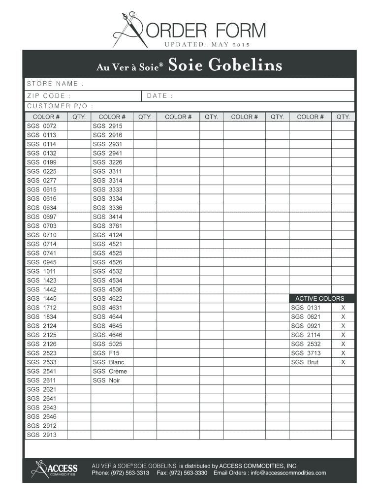 Get the free ORDER FORM UPDATED: MAY 2015 Au Ver Soie Soie Gobelins STORE NAME : DATE : ZIP CODE ...