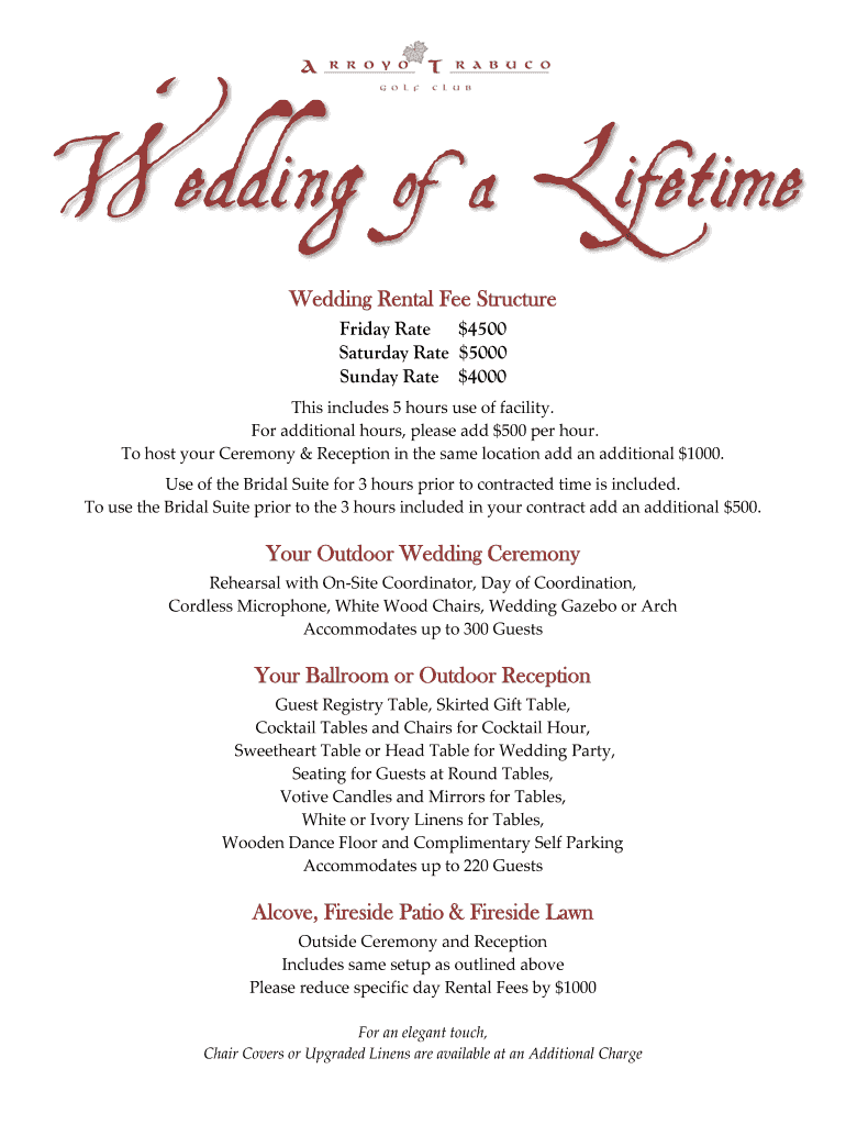 Wedding of aLifetimeWedding Rental Fee Structure Friday Rate $4500 Saturday Rate $5000 Sunday Rate $4000This includes 5 hours use of facility. For additional hours, please add $500 per hour. To host