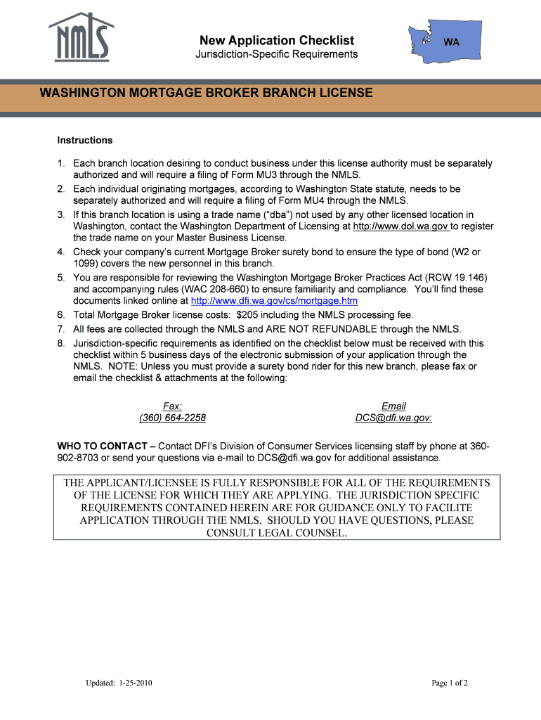 This document provides a checklist of requirements for obtaining a Washington Mortgage Broker Branch License, including instructions for submissions, surety bond requirements, trust accounting, and