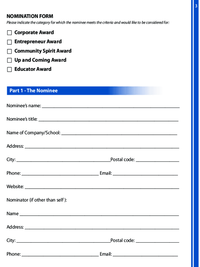 An award nomination form is a form template designed to streamline the process of nominating individuals for awards such as "best worker," "best employee," "best student," or "best member." This form allows organizations, schools, sports clubs, community groups, and industrial corporations to collect nominee