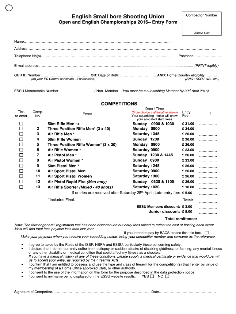 Competitor Number English Small bore Shooting Union Open and English Championships 2016 Entry Form Admin Use Name.... Address. Telephone No’s)...