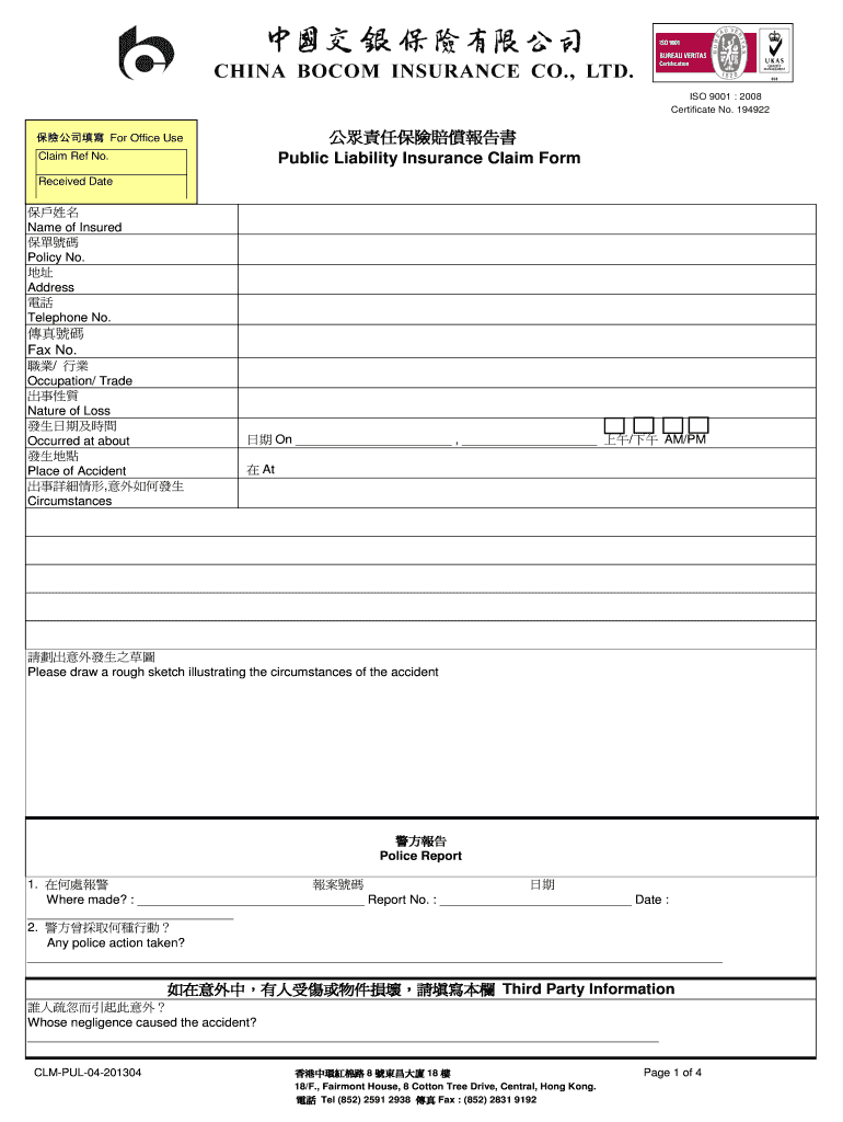 ISO 9001 : 2008 Certificate No. 194922 Public Liability Insurance Claim Form For Office Use Claim Ref No. Received Date Name of Insured Policy No. Address Telephone No. Fax No. / Occupation/ Trade