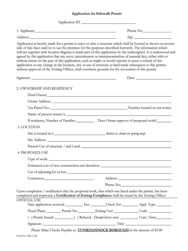 Application for Sidewalk Permit Application ID: 1. Applicant: Phone No: Address: Zip: Application is hereby made for a permit to erect or alter a structure which shall be located as shown on reverse