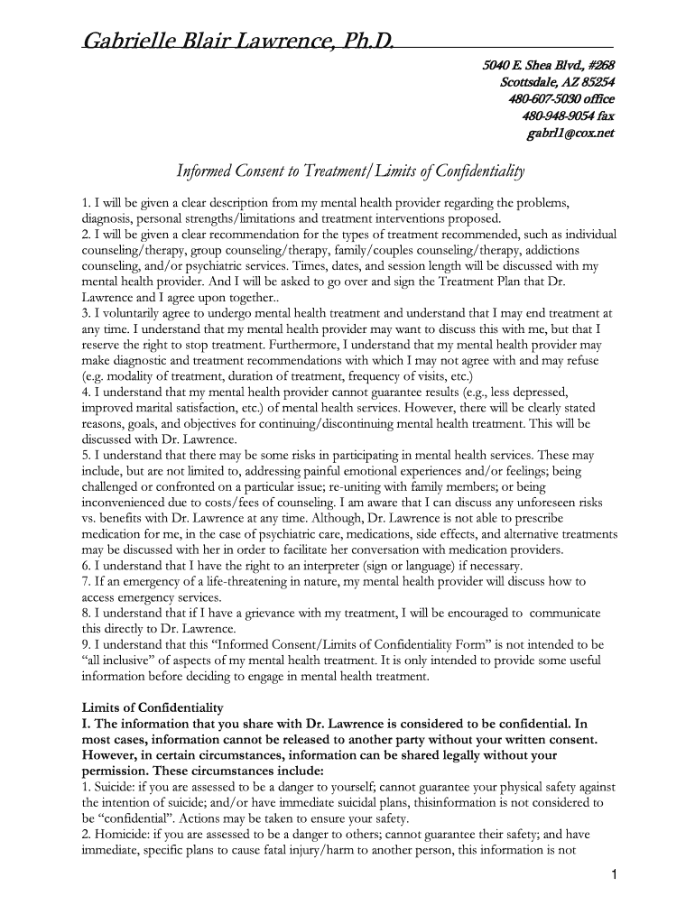 Gabrielle Blair Lawrence, Ph.D. 5040 E. Shea Blvd., #268 Scottsdale, AZ 85254 4806075030 office 4806074809489054 fax 480948gabrl1 cox.net Informed Consent to Treatment×Limits of Confidentiality 1.