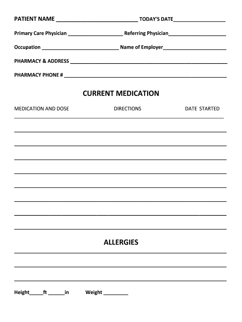 PATIENT NAME TODAY IS DATE Primary Care Physician Referring Physician Occupation Name of Employer PHARMACY & ADDRESS PHARMACY PHONE # CURRENT MEDICATION AND DOSE DIRECTIONS DATE STARTED ALLERGIES