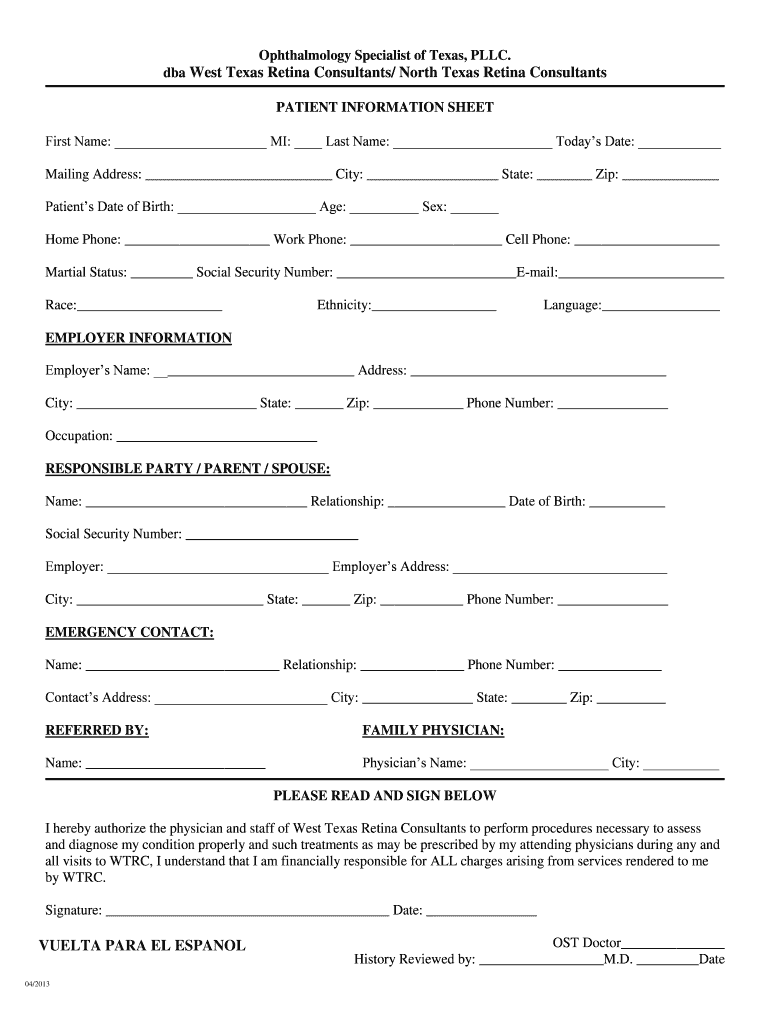 Ophthalmology Specialist of Texas, LLC. DBA West Texas Retina Consultants/ North Texas Retina Consultants PATIENT INFORMATION SHEET First Name: MI: Last Name: Today's Date: Mailing Address: City: