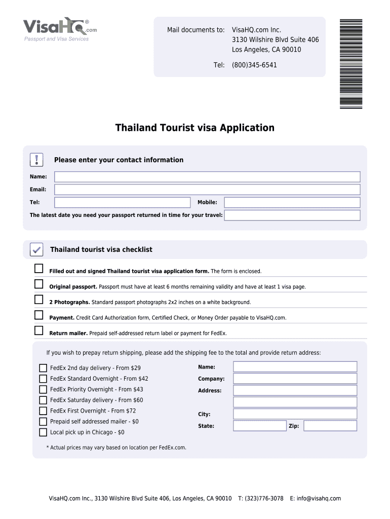 Mail documents to: Tel: VisaHQ.com Inc. 3130 Wilshire Blvd Suite 406 Los Angeles, CA 90010 ×800×3456541 Thailand Tourist visa Application Please enter your contact information Name: Email: Tel: