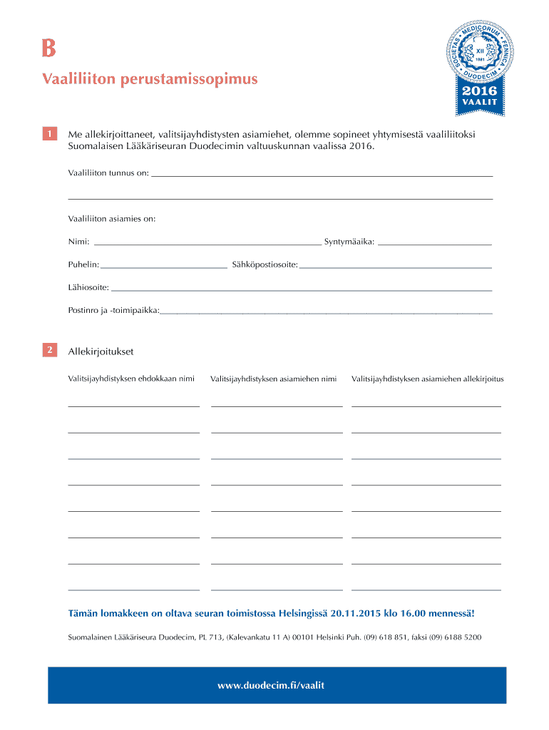 B Vaaliliiton perustamissopimus Me allekirjoittaneet, valitsijayhdistysten asiamiehet, let me spinet yhtymisest vaaliliitoksi Suomalaisen Lkriseuran Duodecimal valtuuskunnan Alissa 2016. Vaaliliiton