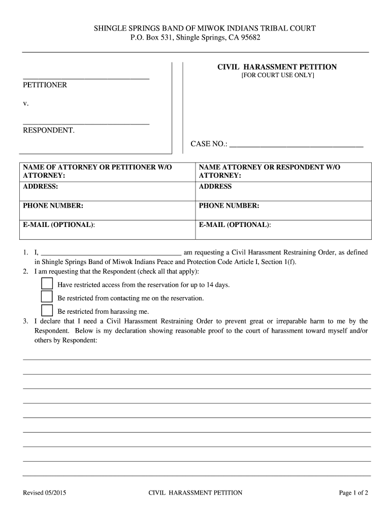 SHINGLE SPRINGS BAND OF MINOR INDIANS TRIBAL COURT P.O. Box 531, Shingle Springs, CA 95682 CIVIL HARASSMENT PETITION FOR COURT USE ONLY PETITIONER v. RESPONDENT. CASE NO.: NAME OF ATTORNEY OR PETITIONER