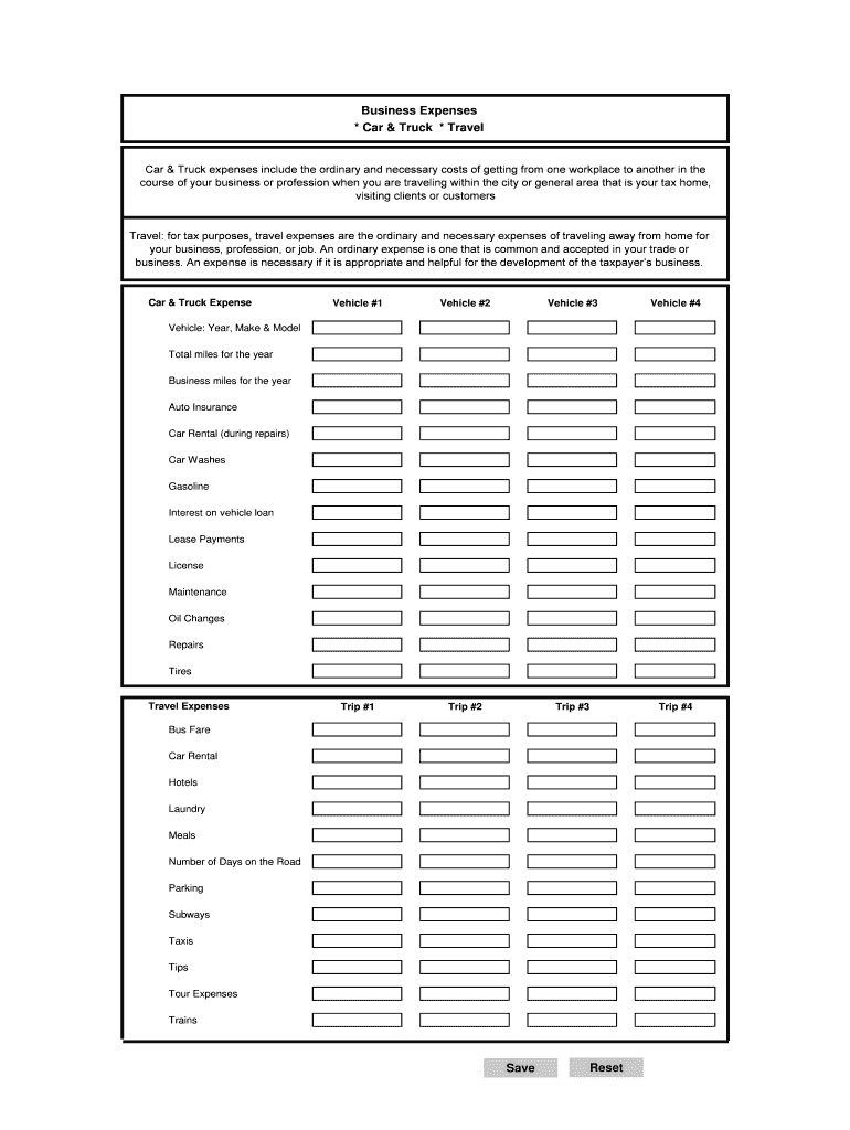 Business Expenses * Car & Truck * Travel Car & Truck expenses include the ordinary and necessary costs of getting from one workplace to another in the course of your business or profession when you