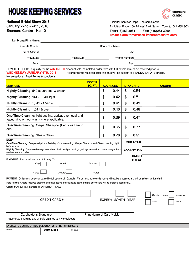 National Bridal Show 2016 January 22nd 24th, 2016 Energies Center Hall D Exhibitor Services Dept., Energies Center Exhibition Place, 100 Princes Blvd. Suite 1, Toronto, ON M6K 3C3 Tel:(416×2633064