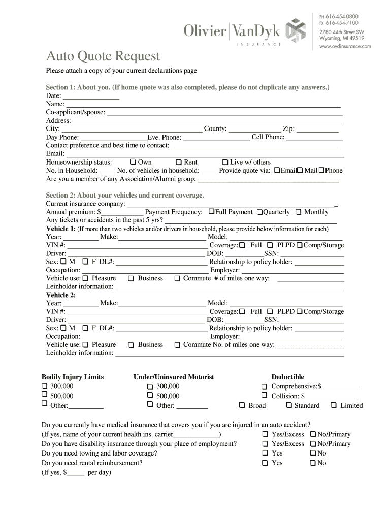 To fill out an auto quote request, you will need to provide your personal information, vehicle details, and desired coverage levels.