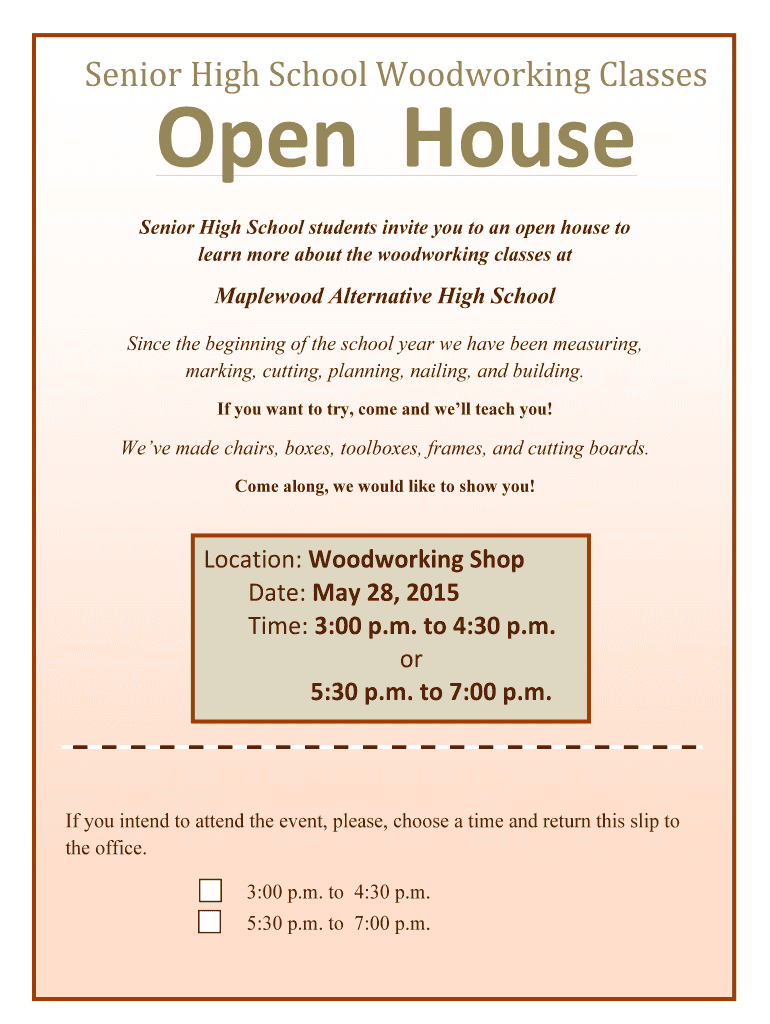 Senior High School Woodworking Classes Open House Senior High School students invite you to an open house to learn more about the woodworking classes at Maple wood Alternative High School Since the