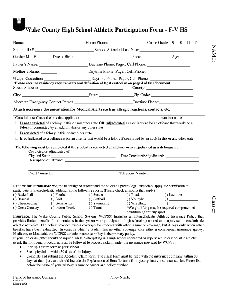 The Wake County High School Athletic Participation Form is a medical consent document used by students and their guardians in North Carolina to obtain permission for participation in interscholastic athletics.