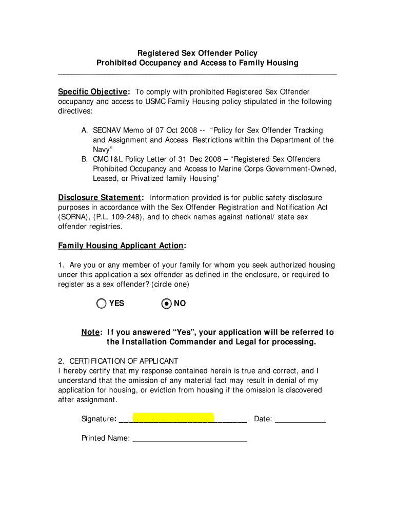 This document outlines the policy regarding prohibited occupancy and access for registered sex offenders in USMC Family Housing, including compliance with relevant directives and the applicant's certification