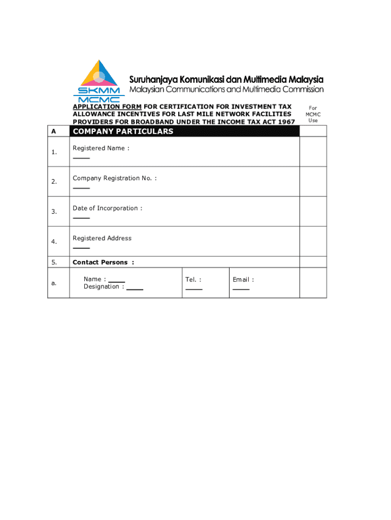 How to fill out APPLICATION FORM FOR CERTIFICATION FOR INVESTMENT TAX ALLOWANCE INCENTIVES FOR LAST MILE NETWORK FACILITIES PROVIDERS FOR BROADBAND UNDER THE INCOME TAX ACT 1967