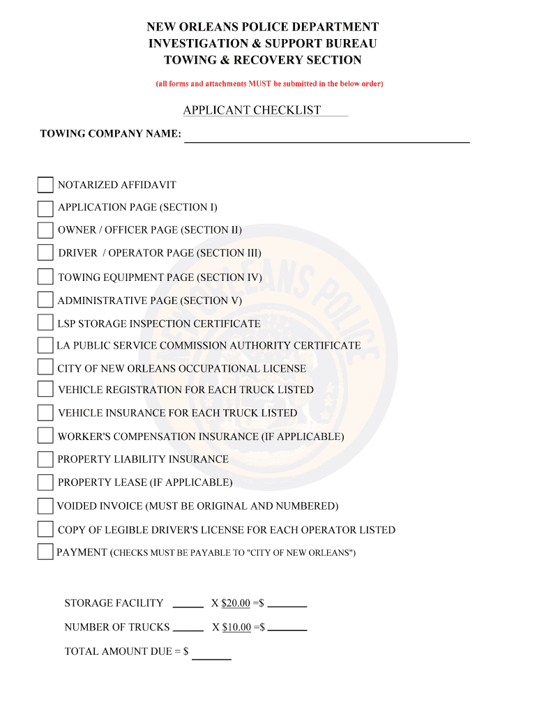 NEW ORLEANS POLICE DEPARTMENT INVESTIGATION & SUPPORT BUREAU TOWING & RECOVERY SECTION (all forms and attachments MUST be submitted in the below order) APPLICANT CHECKLIST TOWING COMPANY NAME: NOTARIZED
