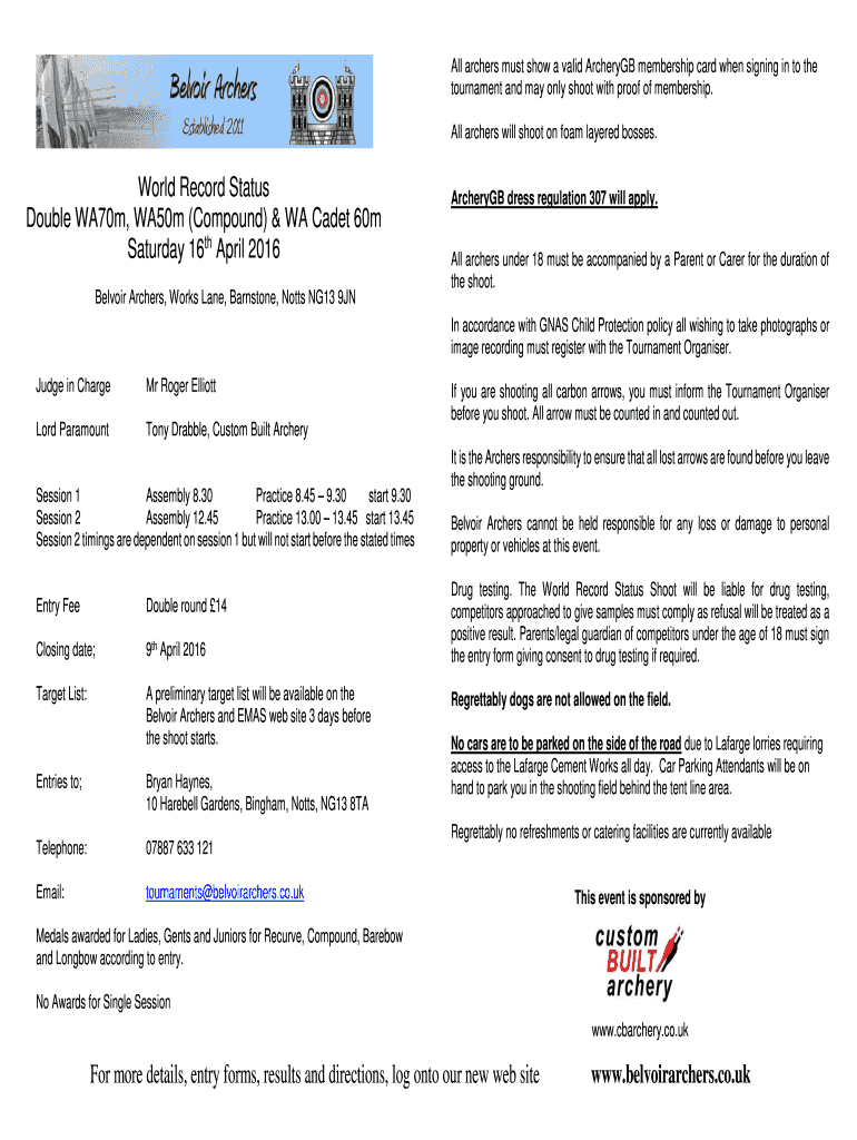 All archers must show a valid Archery GB membership card when signing in to the tournament and may only shoot with proof of membership. All archers will shoot on foam layered bosses. World Record