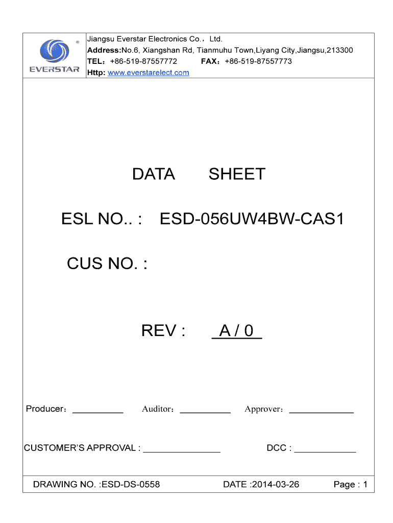 Jiangsu Ever star Electronics Co. Ltd. Address:No.6, Tangshan Rd, Tianmuhu Town, Loyang City, Jiangsu,213300 TEL +86-519-87557772 FAX +86-519-87557773 HTTP: www.everstarelect.com DATA SHEET ESL NO.