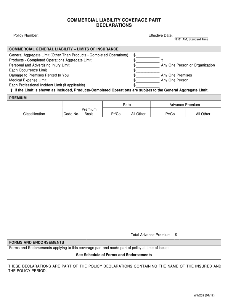 COMMERCIAL LIABILITY COVERAGE PART DECLARATIONS Policy Number: Effective Date: 12:01 AM, Standard Time COMMERCIAL GENERAL LIABILITY LIMITS OF INSURANCE General Aggregate Limit (Other Than Products