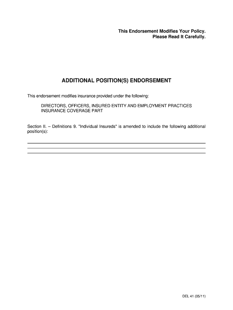 Additional positions endorsement is an official document filed with an insurance company to provide coverage for additional positions or roles that an individual may hold.