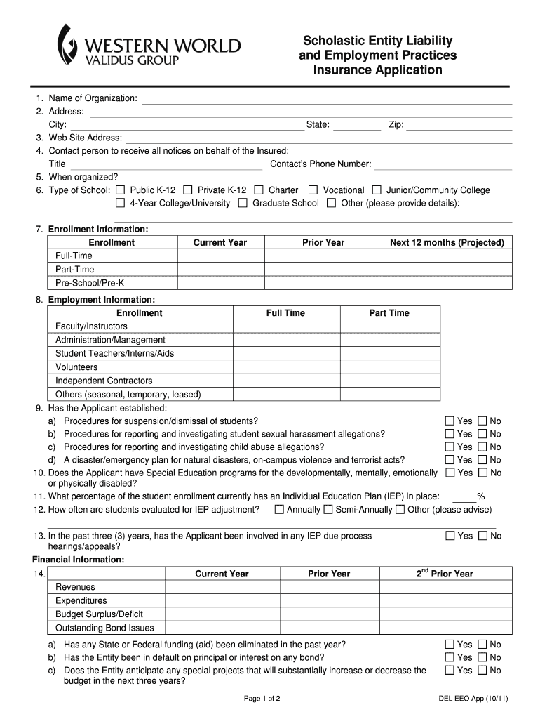 Scholastic Entity Liability and Employment Practices Insurance Application 1. Name of Organization: 2. Address: City: State: Zip: 3. Website Address: 4. Contact person to receive all notices on behalf