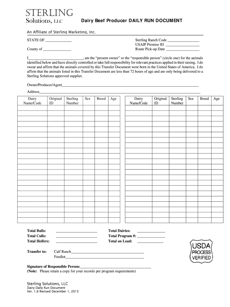 STERLING Solutions, LLC Dairy Beef Producer DAILY RUN DOCUMENT An Affiliate of Sterling Marketing, Inc. STATE OF Sterling Ranch Code US AIP Premise ID Route Pickup Date County of I, am the present