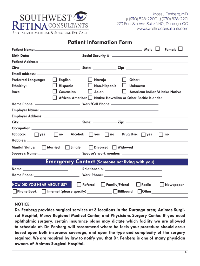 Moss J. Fen berg, M.D. p ×970× 8282200 f ×970× 8282201 270 East 8th Ave. Suite N101, Durango, CO www.swretinaconsultants.com Patient Information Form Patient Name: Male Female Birth Date: Social