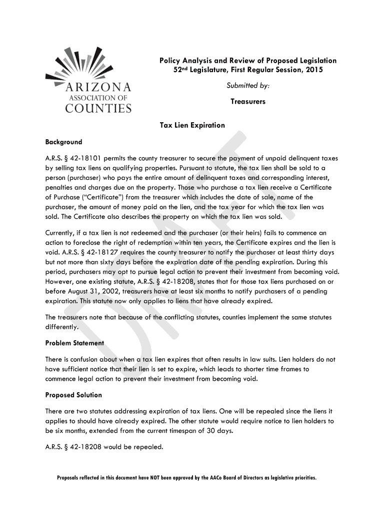 Policy Analysis and Review of Proposed Legislation 52nd Legislature, First Regular Session, 2015 Submitted by: Treasurers Tax Lien Expiration Background A.R.S. 4218101 permits the county treasurer