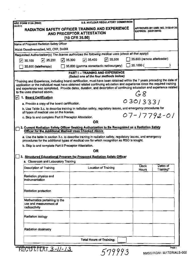 This document is used to provide training and experience details for proposed Radiation Safety Officers (RSOs) as required by the U.S. Nuclear Regulatory Commission (NRC). It includes sections for