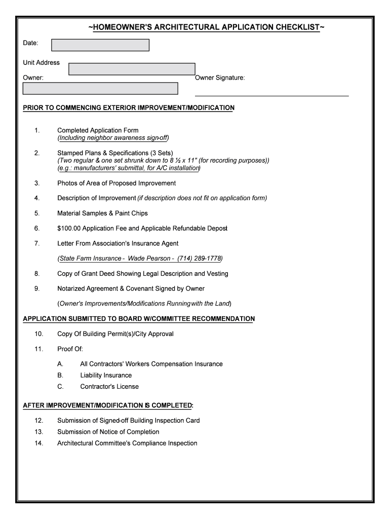 Newport Crest Homeowners Association Architectural Change Application Package HOMEOWNER INSTRUCTIONS Homeowners wishing to complete the Architectural Change form may do so by one of two methods: 1.