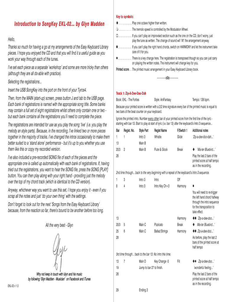 Key to symbols: Introduction to Song Key EKL02... by Glen Madden Hello, Thanks so much for having a go at my arrangements of the Easy Keyboard Library pieces. I hope you enjoyed the CD and that you