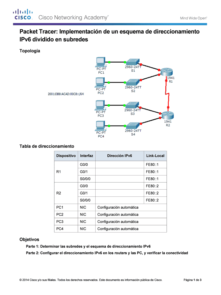 Packet Tracer: Implementation de UN sequela de direccionamiento IPv6 divided en subsides Topology Tabla de direccionamiento Dispositive Internal Direction IPv6 LinkLocal G0×0 FE80::1 FE80::1 G0×0