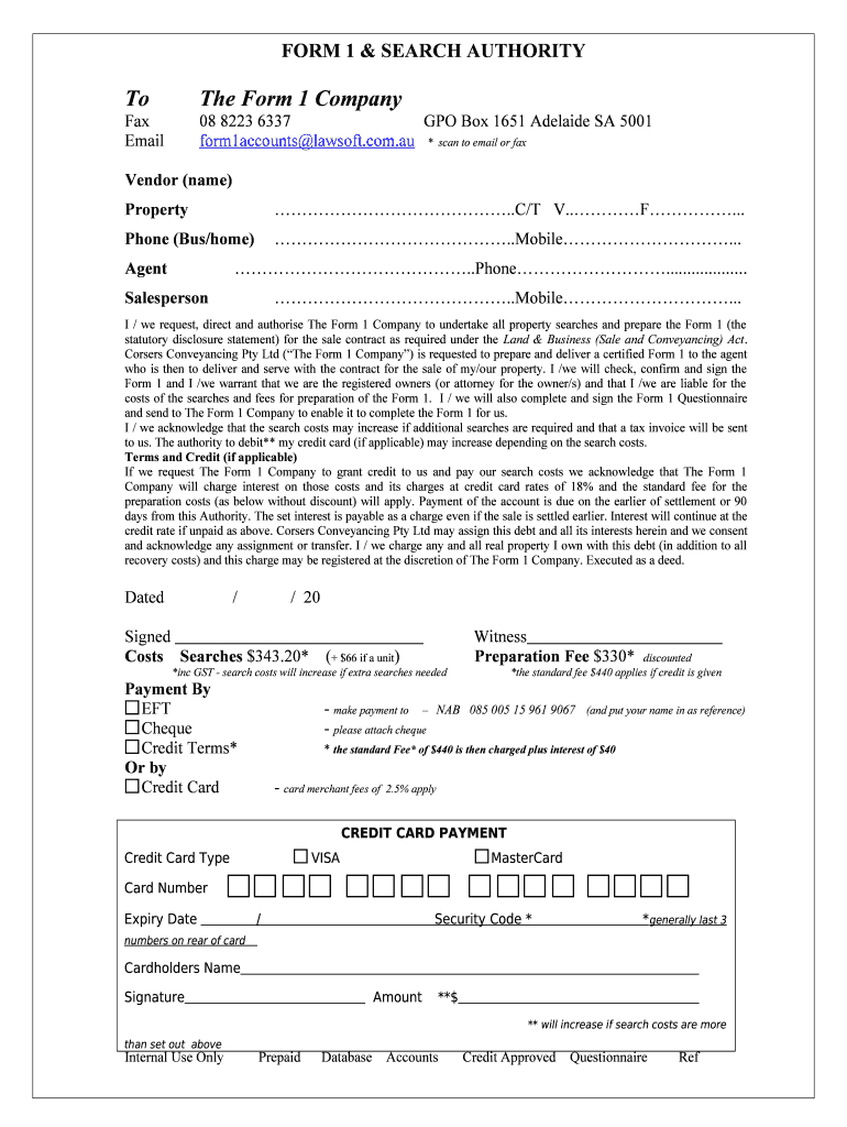 FORM 1 & SEARCH AUTHORITY To The Form 1 Company Fax Email 08 8223 6337 GPO Box 1651 Adelaide SA 5001 form1accounts lawsoft.com.AU * scan to email or fax Vendor (name) Property. C×T V. F... Phone