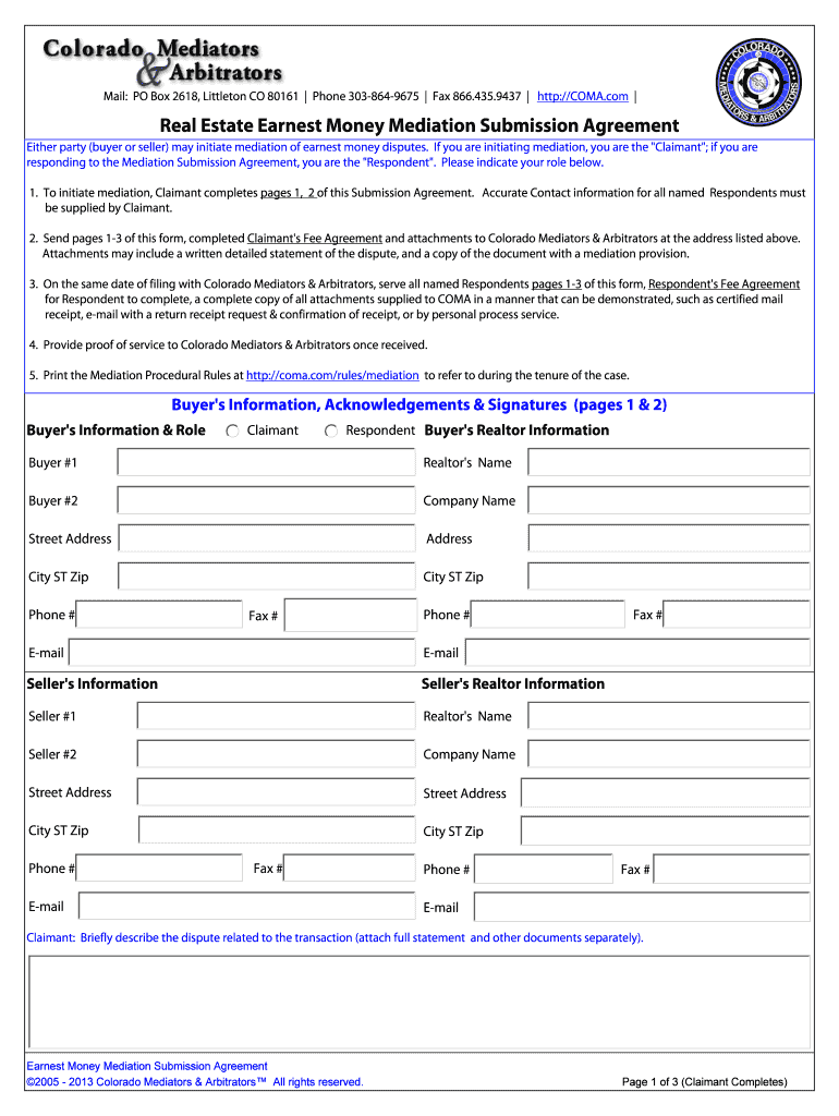 Mail: PO Box 2618, Littleton CO 80161 Phone 3038649675 Fax 866.435.9437 HTTP://COMA.com Real Estate Earnest Money Mediation Submission Agreement Either party (buyer or seller) may initiate mediation