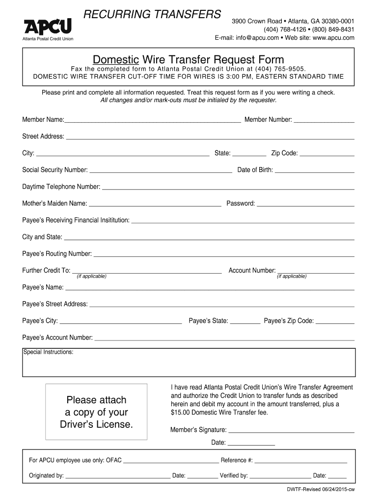 RECURRING TRANSFERS 3900 Crown Road Atlanta, GA 303800001 ×404× 7684126 ×800× 8498431 Email: info apcu.com Website: www.apcu.com Domestic Wire Transfer Request Form Fax the completed form to Atlanta